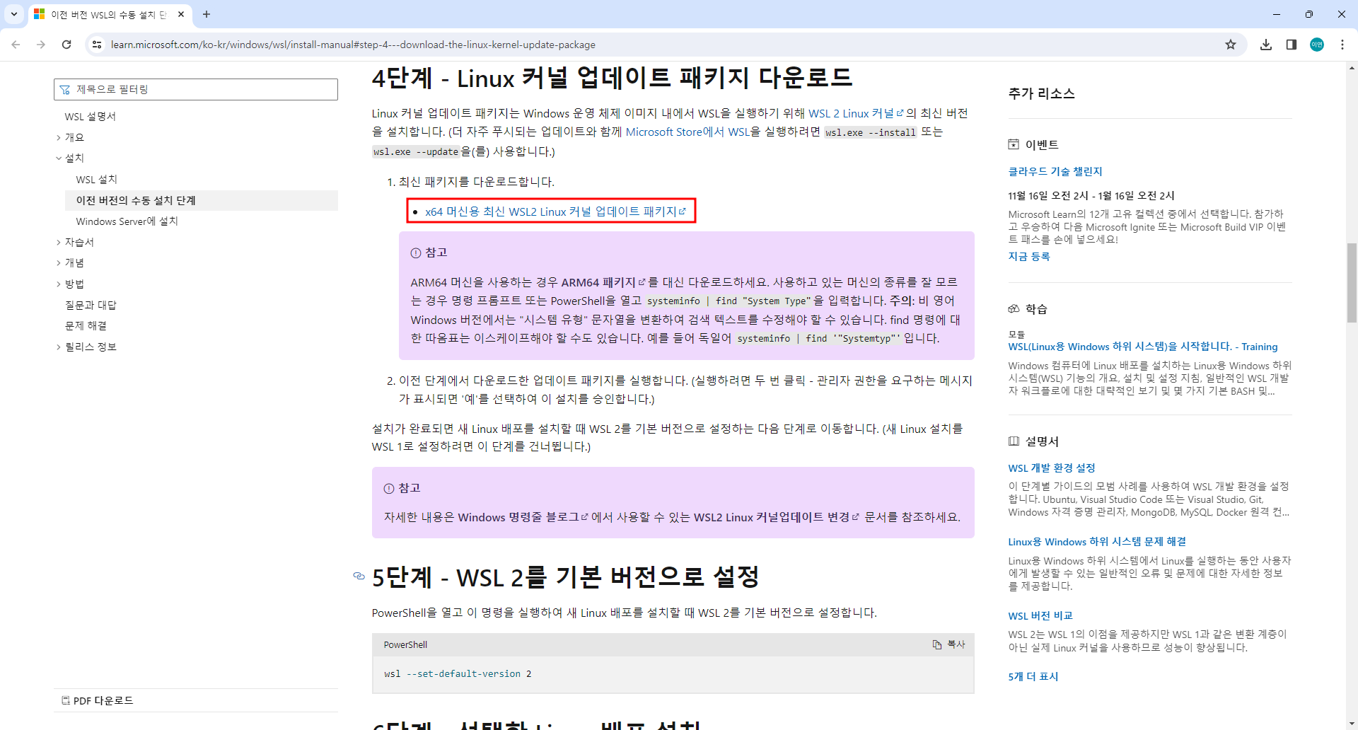 링크에 들어가보니, WSL 업데이트 패키지를 수동으로 다운로드 받아 설치하라는 뜻이었다. 다운로드 받은 파일은 wsl\_update\_x64.msi