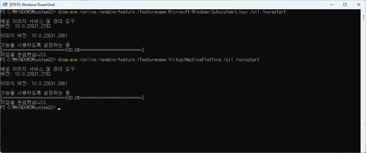 이 때는 Windows Powershell을 관리자 권한으로 실행하여, 아래 코드를 한 줄 씩 입력해준다.