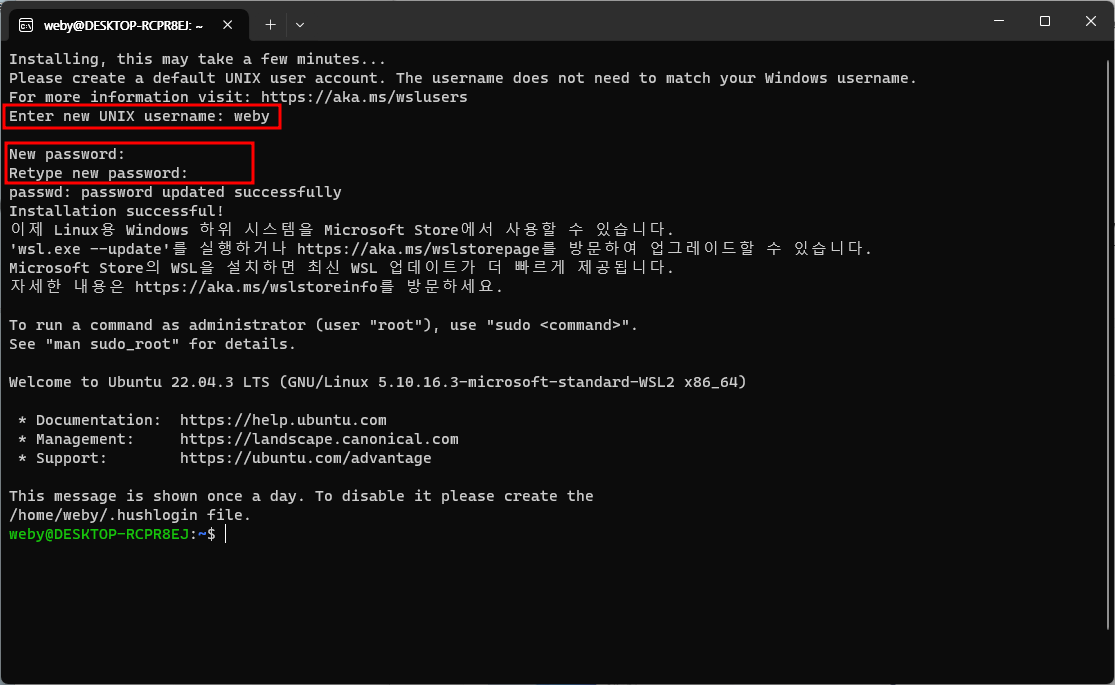 UNIX username과 password를 2회 입력해주면 설치 완료. 이제 본격적으로 WSL을 사용할 수 있게 되었다!