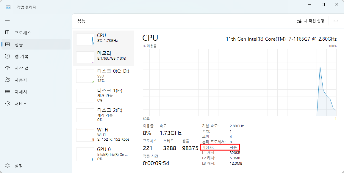 간단하게는 작업 관리자에서 확인할 수 있다. 성능 탭에서 가상화 : 사용